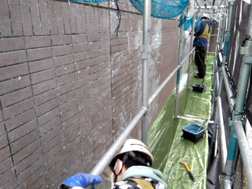 以前の所有者の方がタイルにコーティングを施されていたのですが、雨風の影響で剥離が目立ってしまい大変お困りになられているとのことで、タイルの洗浄をご提案。