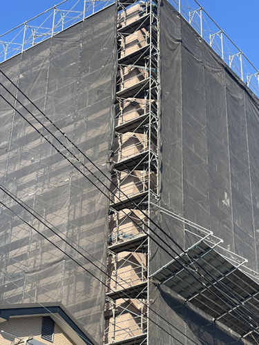 最後に足場のメッシュシートを部分的に解放し、遠くから品質に問題がないかの確認を行い検査が終了になります。