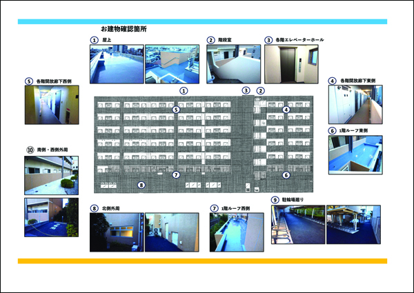 現地での確認会は資料を準備しておりますので、工程の報告や施工写真、また解体前の施主様および弊社の検査是正状況を写真と図面にてご報告し、現場を上から下まで共用部を隈なく確認頂きました。