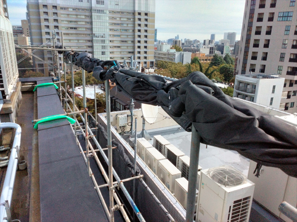 ■足場が風を受けないよう足場の養生シートの一部開放(屋上塔屋廻りは全て開放)